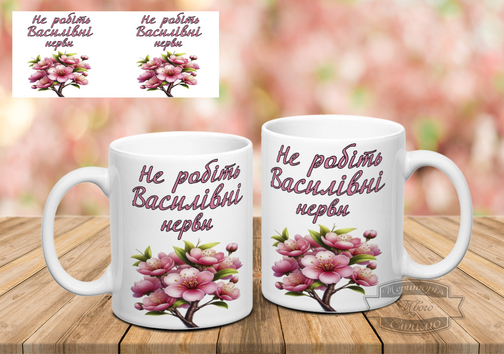 Чашка , з написом Не робіть Василівні нерви, цвіт вишні .