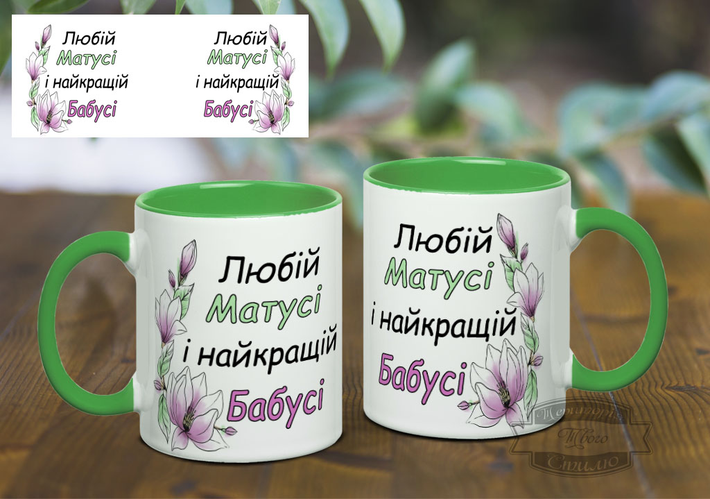 Чашка, з принтом “Любій Матусі і найкращій Бабусі”.