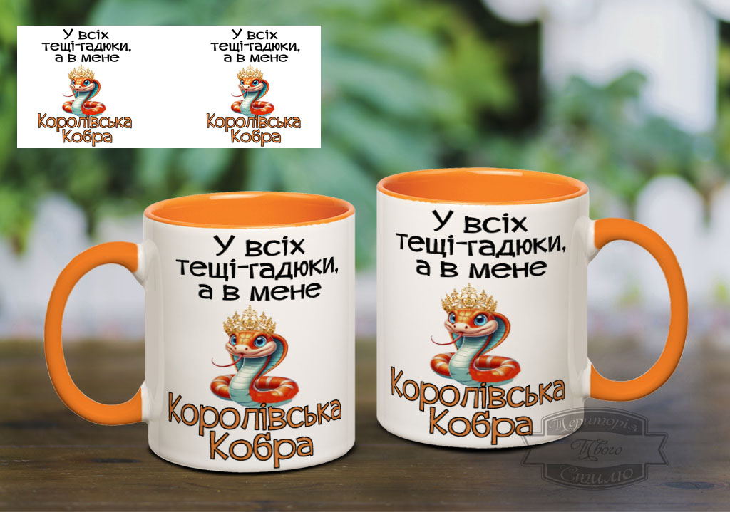 Чашка , з принтом “У всіх тещі-гадюки, а в мене Королівська кобра”.