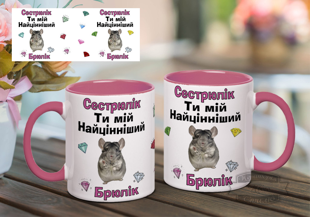 Чашка сестрі, з принтом “Сестрюлік ти мій найцінніший брюлік” з шиншилою.